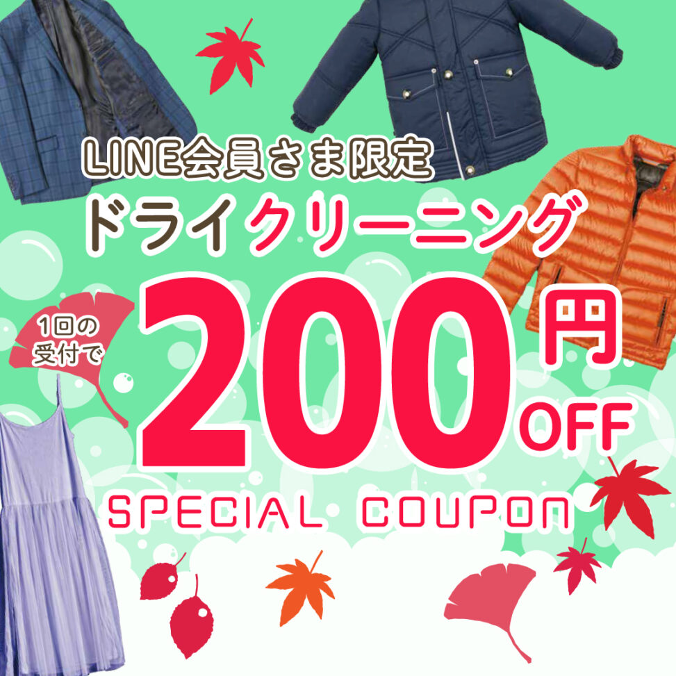 ただいま、LINE友だち限定でドライクリーニング衣類を200円引きでご提供する特別キャンペーンを実施中です。